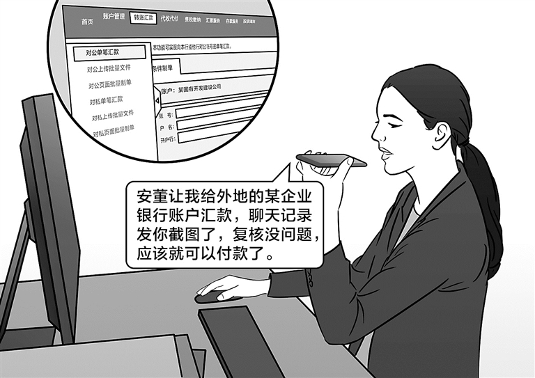 隨后,黃某某被拉入一個(gè)聊天群,并在該群收到備注名為安某某(該公司董事長(cháng))發(fā)來(lái)的消息,詢(xún)問(wèn)黃某某是否接到銀行需要年檢的通知,并在聊天群中“安排公司相關(guān)工作”,這讓黃某某輕信了安某某的身份。隨即,安某某要求黃某某向外地某企業(yè)銀行賬戶(hù)匯款。
